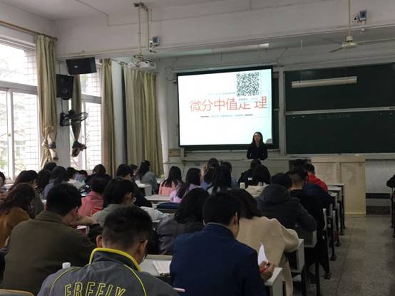 胡倩老师讲授内容为“微分中值定理”(罗尔中值定理、拉格朗日中值定理、柯西中值定理)。参加听课的老师通过扫描二维码加入胡倩老师的“雨课堂”,现场体验学生上台作答、问答互动、现场答题统计、现场答题批改、点评或弹幕到屏幕,有效地展示了“雨课堂”良好的师生课堂互动、及时的授课反馈等特点,让老师们亲身体验了手机进课堂、信息技术辅助实现教与学的新的教学形态。