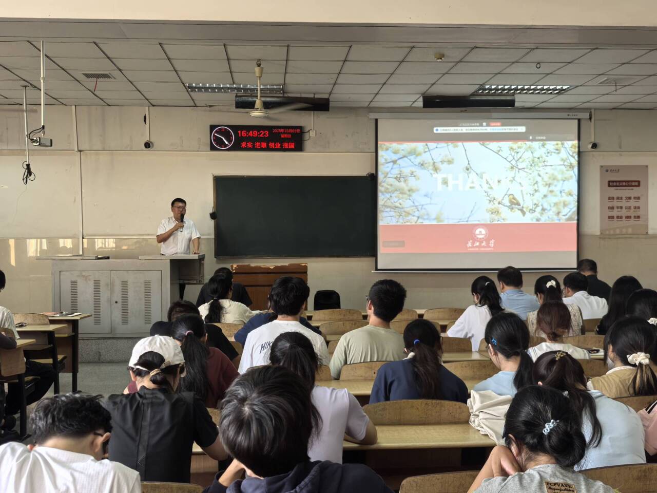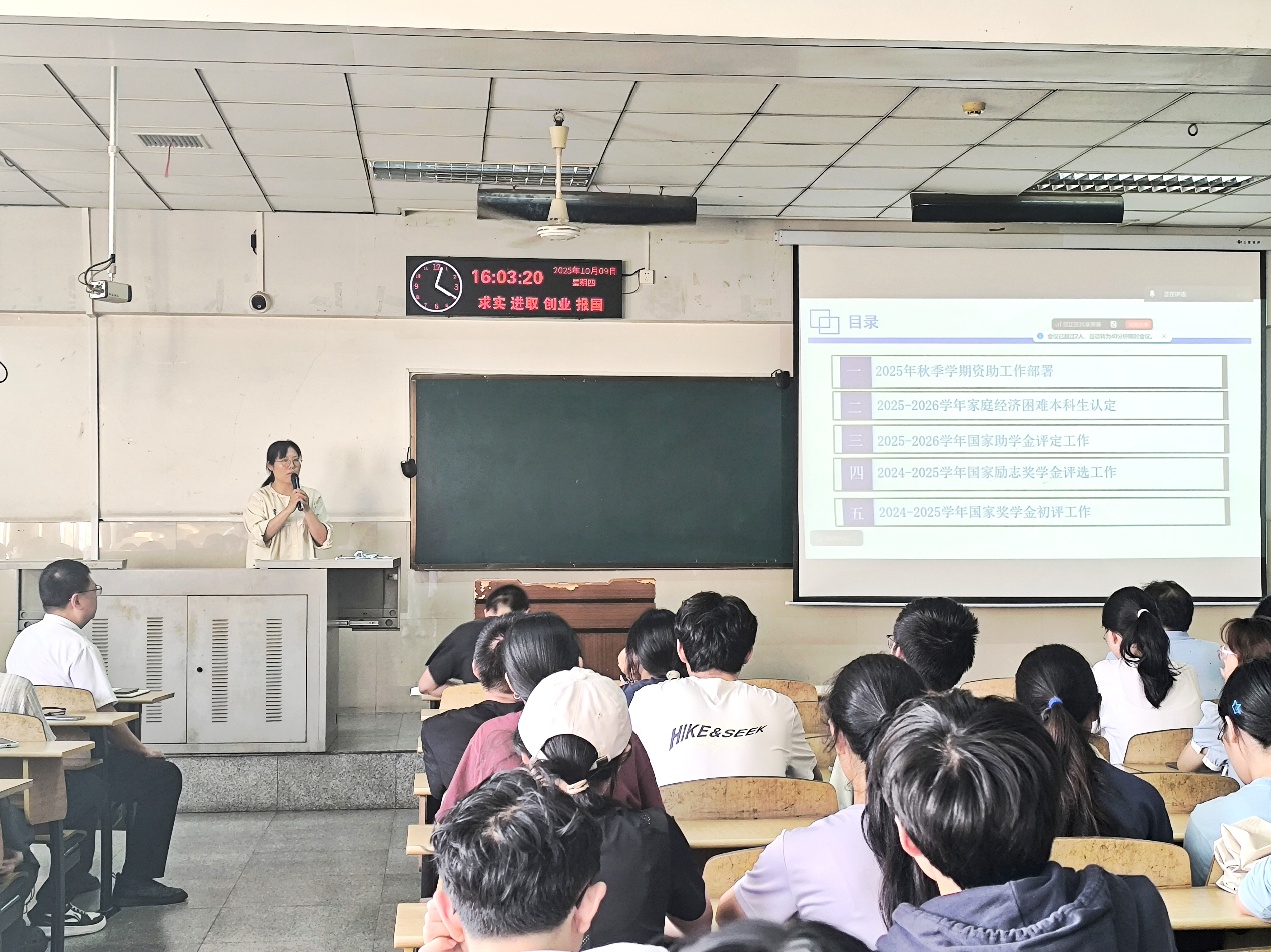 会上,学工办主任姜曼聚焦奖助工作开展讲解。她围绕助学金、励志奖学金、国家奖学金的评选标准、申请流程及注意事项展开详细说明,以清晰的逻辑和通俗的语言,为在场师生梳理出奖助政策的关键要点,让学生干部能更准确地理解和传达相关政策。