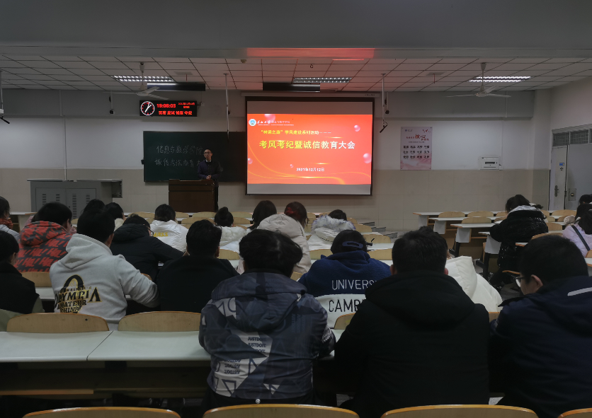 于12月12日晚上七时,七时四十分分别在12教302、402举办诚信考试大会。学工处主任严星以及18、19、20级全体学生参会,院党委副书记袁海山主讲。