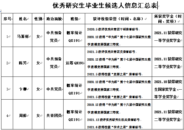 根据学校《关于开展2022届优秀研究生毕业生评选工作的通知》要求,iqqtv 认真组织开展了2022届优秀研究生毕业生评选工作,经个人申请、班级推荐、学院审议,讨论决定拟向学校推荐优秀研究生毕业生4名,现予以公示。