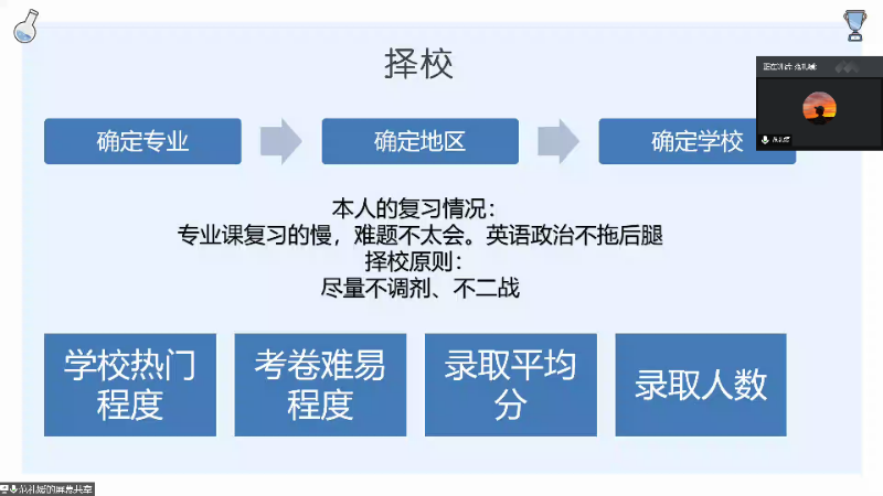随后,范礼媛同学就择校方面补充道:要从各方面了解考研学校的热度,根据自己的强项去选择不同学校。她在英语备考及政治备考两方面做了详细介绍,表示这两门科目都要尽早的去背诵记忆。最后,会议在严星老师与两位主讲人给同学们答疑解惑中落下帷幕。