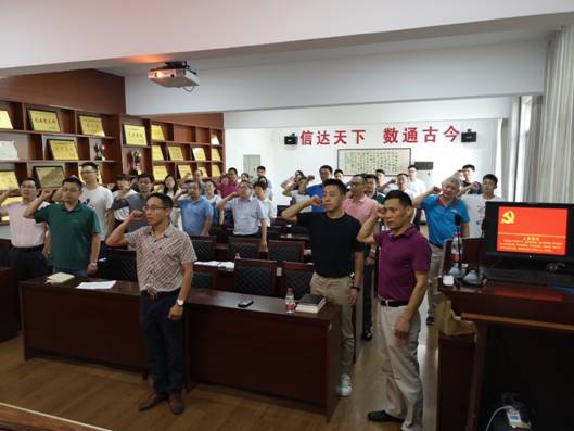 接着,举行9月“支部主题党日”活动。党员全体起立,面向党旗,举起右手,在袁海山副书记的领誓下,重温入党誓词。