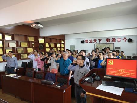 第二阶段,举行4月“支部主题党日”活动。党员全体起立,面向党旗,举起右手,在学院党委副书记袁海山领誓下,重温入党誓词。随后,以党支部为单位开展了学习讨论活动。最后党员按要求交纳了党费。