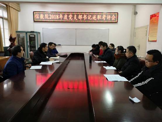 随后,在8教400会议室召开2018年度党支部书记抓党建述职评议会。数学与应用数学系、信息与计算科学系、应用统计系3个教工党支部书记李向军、邹健、李勇和学生党支部书记严星分别进行年度工作述职。根据党支部建设的职责和要求,各支部书记围绕学习宣传贯彻党的十九大精神、学习习近平总书记系列重要讲话精神、“三会一课”制度落实、主题党日活动开展、民主评议党员、发挥党员先锋模范作用等方面进行汇报,全面总结各党支部一年来的工作情况,认真分析工作中存在的问题与不足,并提出下一步的工作思路和改进举措。
