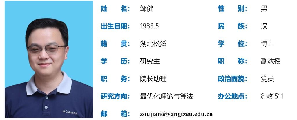 邹健,男,1983年5月出生,博士研究生,副教授。主要研究方向为最优化理论与算法、图像处理;主持完成国家自然科学基金1项;发表学术论文30余篇,其中被SCI检索20余篇;获得iqqtv
