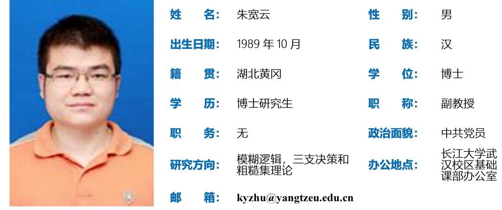 朱宽云,男,1989年10月出生,博士研究生,副教授。主要从事模糊逻辑、三支决策和粗糙集理论研究。2019年6月毕业于武汉大学数学与统计学院,同年7月入职iqqtv