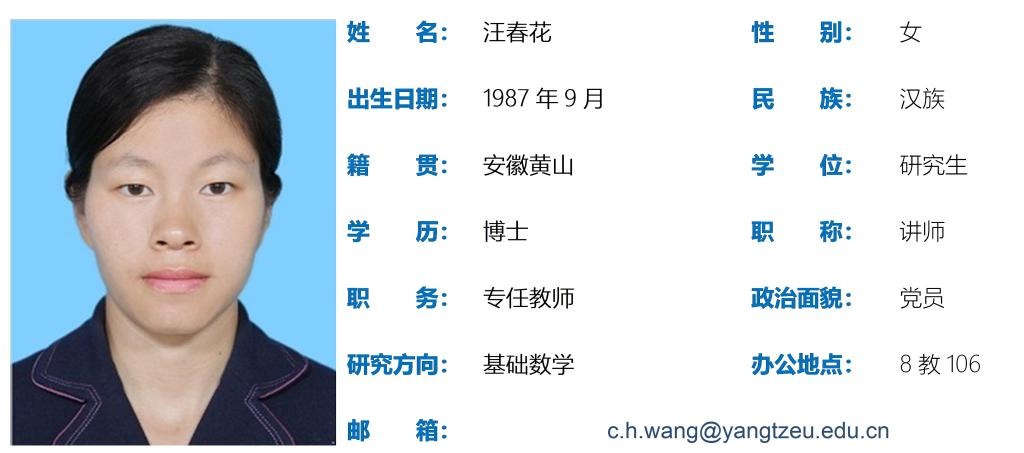 汪春花,女,1987年9月出生,博士研究生,讲师。主要研究方向为基础数学;主持长江青年基金项目一项,参与国家自然科学基金项目两项;发表SCI论文2篇;获得2022-2023学年度教学质量优秀奖。